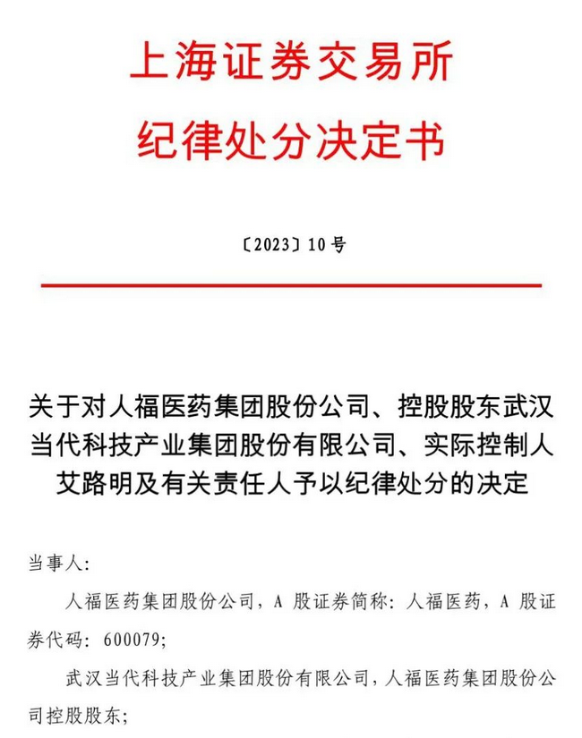 2023年2月7日,上交所发布公告,决定对人福医药集团股份公司、控股股东武汉当代科技产业集团股份有限公司、实际控制人予以纪律处分。