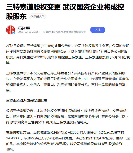 2月3日晚间,三特索道公告,通过股权转让等方式,公司实际控制人将由武汉当代集团的实控人变更为武汉东湖新技术开发区管理委员会。