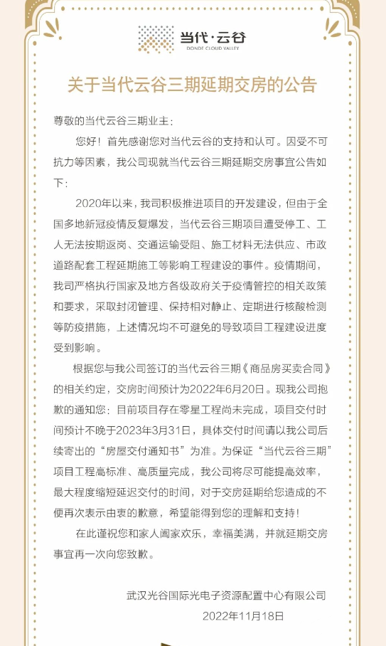 当代云谷三期,在去年11月发布了一则公告,项目交房时间预计延期至不晚于2023年3月31日,具体交付时间以后续寄出的”房屋交付通知书“为准。