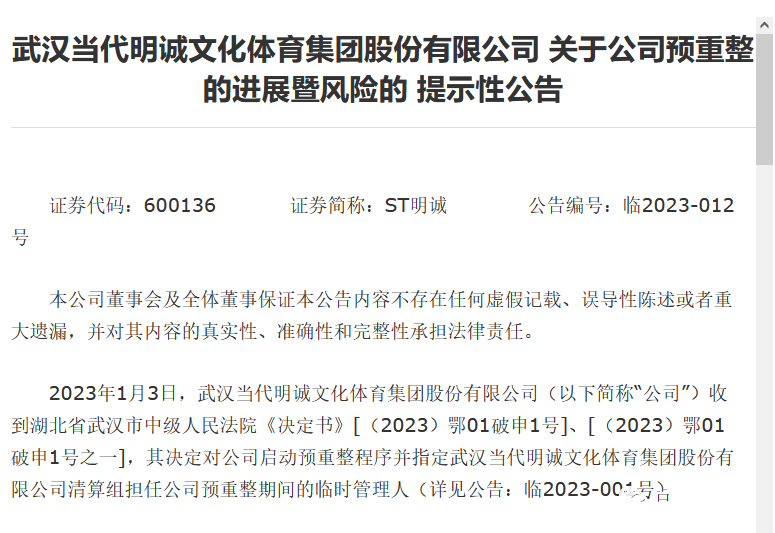 公告指出:2023年1月3日,武汉当代明诚文化体育集团股份有限公司收到湖北省武汉市中级人民法院《决定书》,其决定对公司启动预重整程序并指定武汉当代明诚文化体育集团股份有限公司清算组担任公司预重整期间的临时管理人。