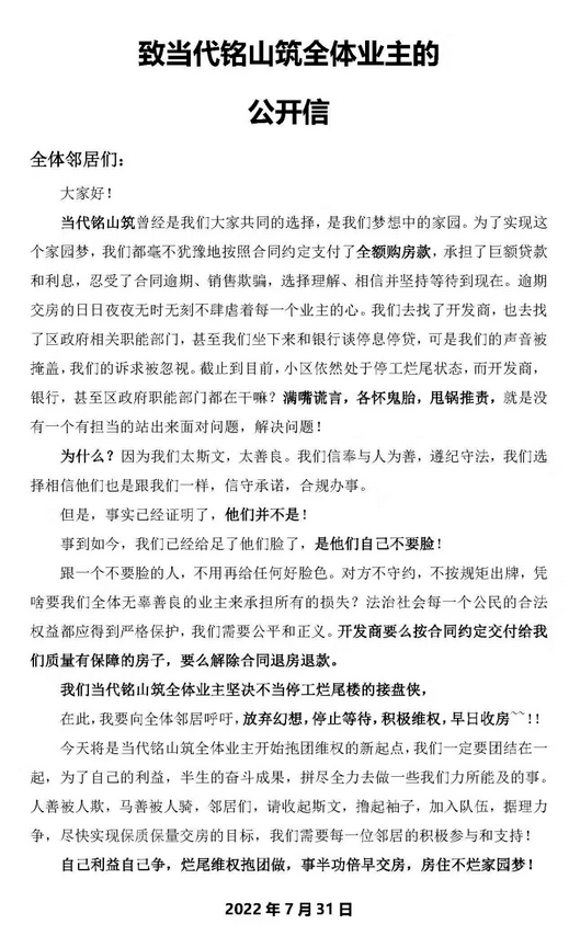 2022年8月,当代铭山筑业主群还发布了一篇全体业主的公开信。
