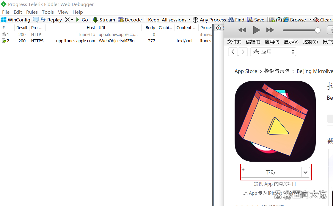 - 此时点击iTunes中的下载按钮,然后会跳转到fiddler4拦截。