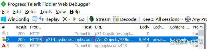 - 在iTunes里搜索需要下载的app,比如某音,点击下载软件,Fiddler4的列表里会出现一条,名称类似于pXXbuy.itunes.apple.com的一项,如下图所示。