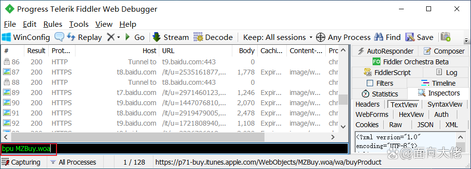 7.打开fiddler4,左侧底部,黑框中输入下面的代码,然后回车,这样下一次请求下载接口时,将不会直接发送,会跳转到fiddler4中,然后拦截这个请求。:bpu MZBuy.woa